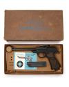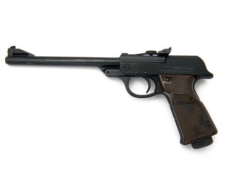 circa 1965, with 9 1/2in. sighted barrel, black crackle finish receiver, blued frame and brown chequered plastic grips, much finish remaining; together with its manufacturer's card carton, boxed barrel weight, English language instruction leaflet, sight elements, a cleaning rod and wood cocking aid
