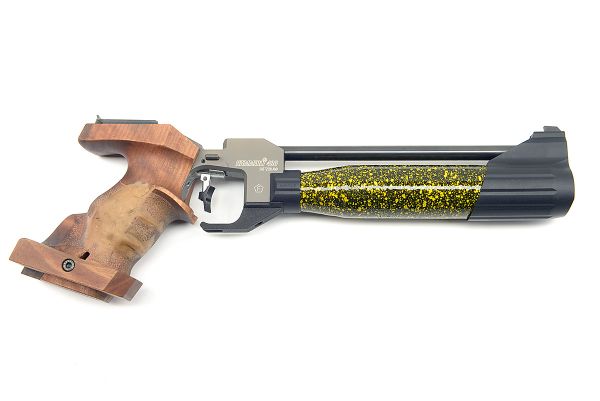 A BOXED .177 PRE-CHARGED PNEUMATIC MATCH AIR-PISTOL SIGNED HAMMERLI, MODEL '480', serial no. 01949, with 10in. sighted barrel, 'still-air' muzzle-break, flip-open breech, walnut anatomical right hand grip (small modifications) and yellow and black fleckle-finished air-reservoir, in its makers carton with accessories, appearing little used but untested