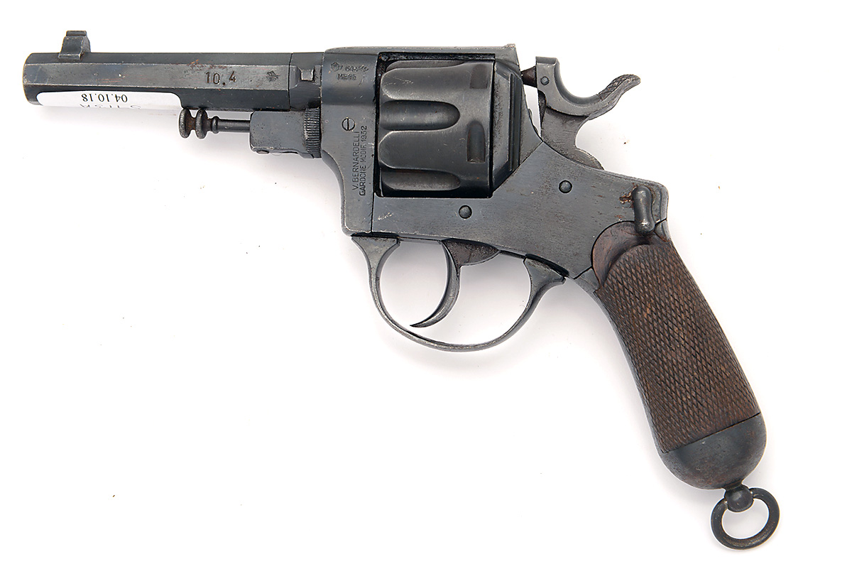 A 10.4mm (ITALIAN ORD.) DOUBLE ACTION REVOLVER SIGNED V. BERNADELLI, MODEL '1932 POLICE', serial no. 5939, with blacked 4 1/2in. octagonal barrel, solid frame marked 'RA GUARDIA DI FINANZA) (Bank Guards), fluted cylinder and chequered walnut grip with heavy domed iron pommel