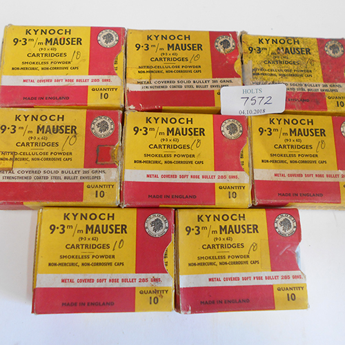 EIGHTY 9.3 X 62 MAUSER CARTRIDGES BY KYNOCH, comprising of eight kynoch cartons of ten rounds in each, some discoloured, 30 steel covered solid 285 grn bullet, 50 soft nose 285 grn