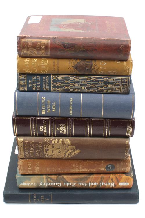 A COLLECTION OF NINE VINTAGE SOUTH AFRICAN RELATED BOOKS, comprising of 'BRITON & BOER', 'NATAL & THE ZULU COUNTRY' by T.V. Bulpin, 'BRITISH AFRICA - BRITISH EMPIRE SERIES VOL II' by Kegan Paul, 'ROMANCE of EMPIRE SOUTH AFRICA' by Ian D. Colvin, 'PAX BRITANNICA' by James Morris, 'THE CRADLE DAYS OF NATAL' by G. Mackeuurtn, 'THE WHITE SHIELD' by Bertram Mitford, 'YANKEE GIRLS iN ZULU LAND' by Louis Vesceluis-Sheldon, 'THE CAPE AND ITS STORY oR STRUGGLE FOR SOUTH AFRICA' by Thomas Nelson (9)
