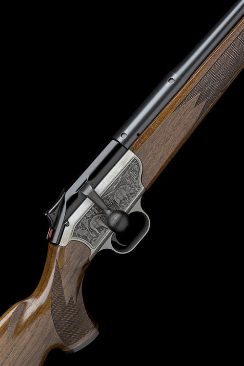 22 3/4in. nitro ported barrel with open rear-sight and high visibility bead fore-sight, bolt numbered FL7669, receiver with Blaser quickly-detachable mount rail notches, game scenes of red and roe deer on the left and wild boar on the right, old silver finish, 14 1/2in. pistolgrip stock with palm swell, hogsback comb, cheekpiece, trademark buttplate, sling swivels and pistolgrip cap, weight 7lb. 10oz.