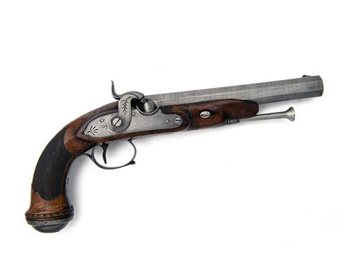 Belgian circa 1830, with twist iron 8in. brushed bright octagonal barrel, blade fore-sight, standing notch rear-sight to the engraved solid top-tang, moulded nipple-boss to side of barrel, borderline engraved lock of flint form with engraved foliate detail to the pointed tail repeated on the hammer, walnut half-stock with sunken chequered panel to the grip, swollen pommel with carved border and plain domed iron butt-cap, winged iron sidenail escutcheon and probable replacement cup-ended iron ramrod