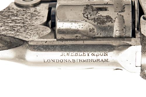 with 3in. sighted barrel signed 'P. WEBLEY & SON LONDON & BIRMINGHAM' on the top-strap, fluted cylinder and break-open frame, the latter marked 'WEBLEY PATENTS W.P. 320' on one side and with 'W&S' winged bullet trademark on the other, rocking frame mounted cylinder locking-catch, chequered hard-rubber grips embossed with the 'W.P.' monogram, the whole retaining much original plated finish throughout .