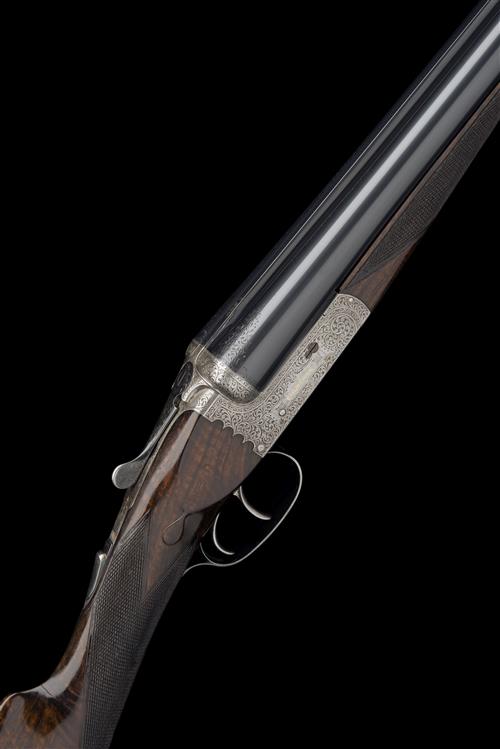 circa 1973, 25in. nitro barrels with matt Churchill-rib gold-inlaid 'XXV' at the breech end, tubes engraved 'CHURCHILL (GUNMAKERS) LTD. 7, BURY STREET. ST. JAMES'S. LONDON. ENGLAND.' and with acanthus scroll engraving at the breech ends, 2 3/4in. chambers, bored approx. imp. cyl. and 1/4 choke, scroll-back action with slender fences, automatic safety with gold-inlaid 'SAFE' detail, double rolled-edge triggerguard, bold acanthus scroll engraving, the makers name in gold in elaborate cartouches, the underside with 'HERCULES FINEST QUALITY MODEL', bright and blued finish overall, 14 1/2in. well-figured stock with engraved skeletal steel buttplate, weight 6lb. 5oz., in its lightweight leather case with some accessories