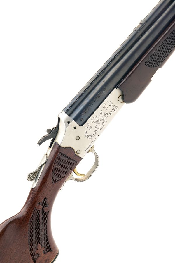 SAVAGE ARMS 20-BORE (3IN.) / .22 WIN. MAG. '24J-DL' SINGLE-TRIGGER OVER AND UNDER COMBINATION HAMMER GUN / RIFLE, serial no. 35, 24in. superior proofed nitro barrels, 3in. shot chamber, bored approx. full choke, rebounding central hammer with barrel selector switch, alloy action with naive scenes of fox and turkey, gold-washed trigger, 15in. ornately chequered pistolgrip stock including 1in. ventilated rubber recoil pad, pistolgrip cap, montecarlo type comb