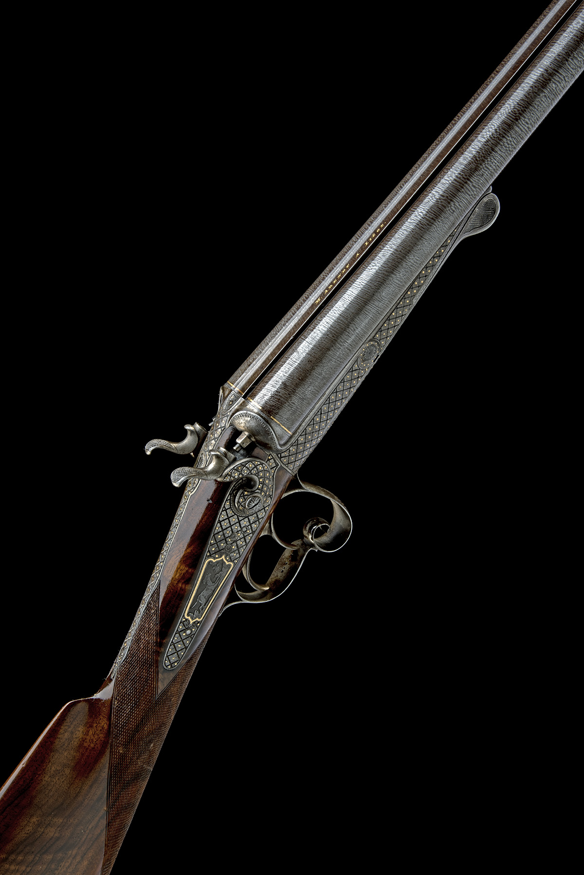 circa 1885, 28 1/2in. black powder only reproved damascus twist barrels (in 2025), the rib gold-inlaid 'M. ARENDT. A LIEGE.', the breech end with a gold-inlaid band, 2 1/2in. chambers, bored approx. true cyl. in both, carved percussion fences, back-action locks with non-rebounding hammers, Lefaucheux patent forward facing underlever, captive fore-end, ornate scrolled triggerguard with front hand rest, the whole engraved with latticework designs with central gold-inlaid points, the locks with central vignettes of hounds flushing fowl and rabbit with gold-inlaid frames, 14 3/8in. figured stock with cheekpiece, sling swivels and steel buttplate, weight 6lb. 14oz.