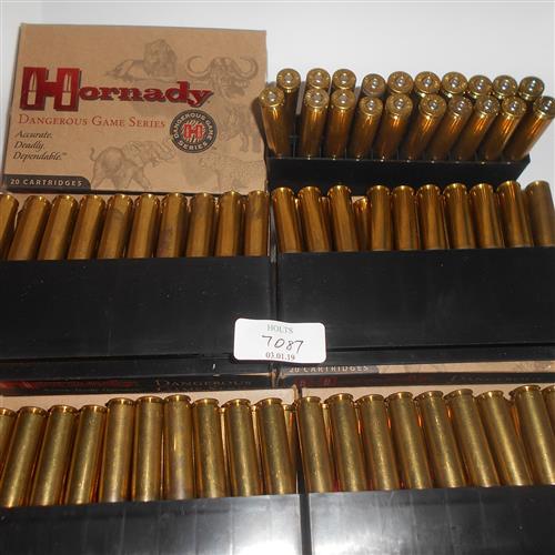 EIGHTY SIX .404 JEFFREY'S AMMUNITION BY HORNADY, comprising of four cartons of 20 rounds in each of 400 grn dgx #8238 and one carton with just four rounds in and some cases, approximately 20 rounds have corrosion on the cases.