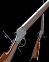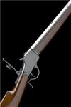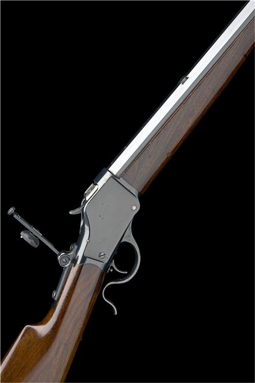 for 1898, with octagonal to round blued 30in. barrel, later dove-tailed adjustable tunnel fore-sight, blanked off rear-sight dove-tail, the top flat of barrel signed 'MANUFACTURED BY THE WINCHESTER REPEATING ARMS CO. NEW HAVEN CONN. USA PATENTED OCTOBER 7 1879' and drilled and tapped for telescopic sight mounting blocks (missing, holes blanked off), slab-sided blued falling-block action with central hammer, top-tang fitted with a later folding ladder vernier peep sight, straight-hand butt-stock, nickel-plated Swiss-style heel-plate, blued under-lever, special Winchester single set trigger, walnut splinter fore-end with inlet ebony tip, much finish remaining