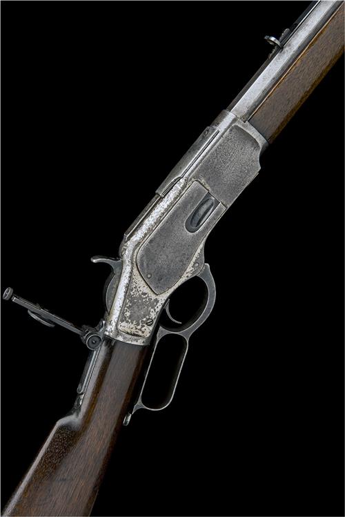 for 1888, with octagonal 24 1/4in. barrel, dove-tailed nickel-bladed fore-sight, buckhorn rear-sight, the top left-hand flat of barrel signed 'WINCHESTER'S REPEATING ARMS NEW HAVEN CONN. USA.' over 'KINGS IMPROVEMENT PATENTED MARCH 29 1866, OCTOBER 16 1860', slab-sided plated action with central hammer, sliding dust-cover, top-tang fitted with a folding Lyman type vernier ladder peep sight, straight-hand butt-stock, iron crescent heel-plate (traces of plating), iron under-lever, plain trigger, walnut fore-end with plated iron nose cap and full length tubular magazine, traces only of both blue and plated finishes remaining