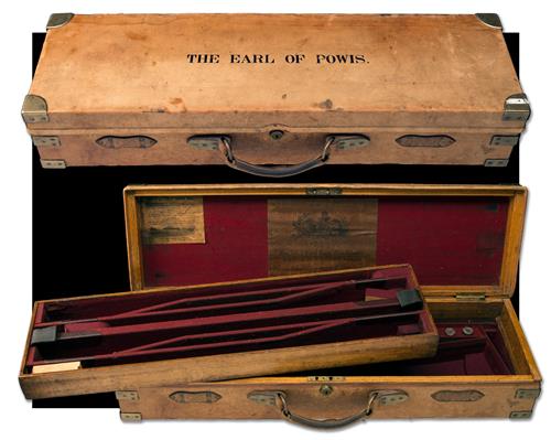 fitted for four sets of 27in. barrels (could adapt to 30in.), the interior lined with maroon baize, a Boss & Co. trade label, central brass lock (key missing), the lid exterior embossed with 'THE EARL OF POWIS'