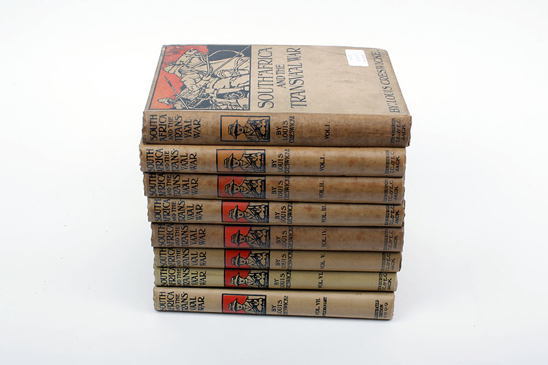 A COLLECTION OF EIGHT VOLUMES 'SOUTH AFRICA AND THE TRANSVAAL WAR' by LOUIS CRESWICKE, in seven volumes Edinburgh, T.C. & E.C. jack 1900 - two copies of vol 1, 'From The Foundation of Cape Colony to the Boer Ultimatum of the 9th Oct. 1899, with numerous illustrations and maps, Vol 2 'From the Commencement of the War to the Battle of Colenso, 15th Dec. 1899', vol 3 'from the battle of colenso 15th Dec. 1899, to Lord Roberts Advance into the Free State 12th Feb 1900', vol 4 'From Lord roberts' Entry into the Free State to the Battle of Karree, vol 5 'From the Disaster at Koorn Spruit to Lord Roberts Entry into Pretoria', vol 6 'From the Occupation of Pretoria to Mr Kruger's Departure from South Africa, with a Summarized account of the Guerilla war to march 1901', vol 7 'the Guerilla War, from February 1901 to the Conclusion of Hostilities, the Development of Peace Negotiations from February 23, 1901, to may 31, 1902', ' (8)