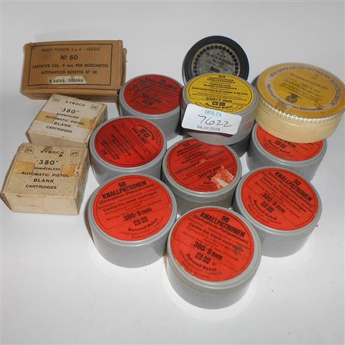 APPROXIMATELY 600, .32/.380-9mm + 200 .22 BLANK CARTRIDGES, comprising of about 20 .32/7mm blank, 200 .22 blank, 260 .38-9mm blank in dynamit nobel retail containers, 100 9mm fiocchi, 50 kynoch hammerless 380 blank
