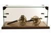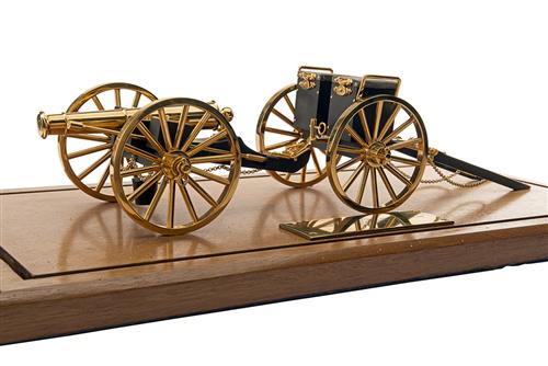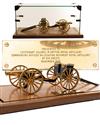 approximately 1/10th scale with 6in. gilt brass barrel, ebonised trolley with gilt brass spoked wheels, ebonised side panniers and gilt loading rods, complete with its matching ammunition limber and mounted on a hardwood board with applied brass plaque reading 'PRESENTED TO LIEUTENANT COLONEL M. SMYTHE ROYAL ARTILLERY, COMMANDING OFFICER 94 LOCATING REGIMENT ROYAL ARTILLERY, BY HIS SNCO'S NOVEMBER 1988', the ensemble together with a brass cornered plate-glass cover approximately 22in. x 10in. x 10in.