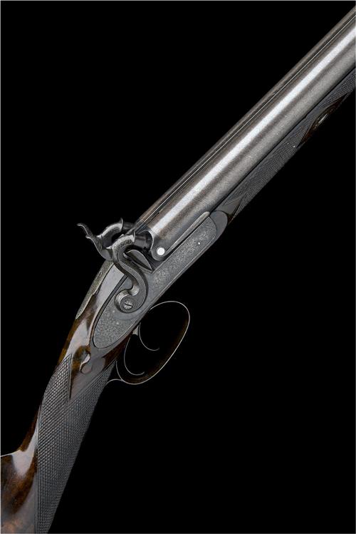 A 12-BORE PERCUSSION DOUBLE-BARRELLED PIGEON-GUN, no visible serial number,