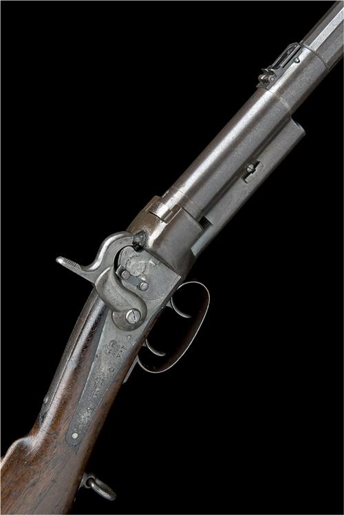 dated for 1856, with tapering round 18in. barrel, dove-tailed block and blade fore-sight, elevating ladder rear-sight, central section of outer barrel faceted for grip, plain receiver, long plain top-tang marked 'GREENE'S PATENT JUNE 27 1854', back-action lockplate fitted with 'Maynard's' tape priming system and marked 'MASS. ARMS CO. CHICOPEE FALLS USA 1856' a 'VR' crown cypher and 'MAYNARD'S PATENT SEPT 22 1845', plain hammer, walnut butt-stock with iron patch-box and semi-crescent heel-plate, saddle-ring to the trigger-guard tang, large trigger-guard bow with two triggers, the front one unlocking the barrel for loading, sold out of service and ordnance stamps, no provision for fore-end