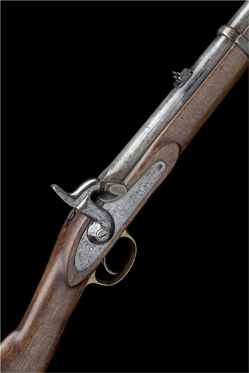 dated for 1855, with 24in. barrel, block and blade fore-sight, folding leaf rear-sight (leaf replaced), ordnance and sold out of service stamps at breech, plain borderline engraved signed and dated lock with 'V.R.' crown device at tail, walnut three-quarter stock with brass furniture, two iron barrel-bands, swivels and iron ramrod