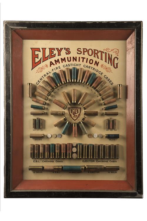 circa 1895, 31in. x 25 1/4in. ebonised outer frame (small chips and losses) with a red-painted wooden bevelled inner frame behind the glass, the off-white background printed with 'ELEY'S SPORTING AMMUNITION' surrounded by arabesques above the arched legend 'CENTRAL-FIRE GASTIGHT CARTRIDGE CASES', above a comprehensive arched display of paper cases in all gauges between .360 shotgun to 4-bore shotgun and including rare sizes such as 32-bore, 24-bore and 14-bore and also including cases advertising various powder types such as 'Curtis & Harvey', 'Walsrode', 'Cannonite', 'Hall's', 'E.B. Nitro' and others, together with various case qualities from 'Ejector' to 'Pegamoid', the whole with a little fading and colour loss and in original unrestored condition
