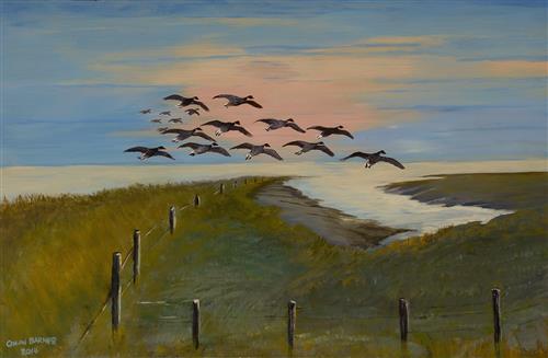 'CROSSING THE LOCK - BARNACLE GEESE' original oil on board signed by the artist, dated 2016, measuring approx. 27in. x 32in. 'PINKFEET (MOONSHADOWS)' original oil on board signed by the artist, dated 2015, measuring approx. 25in. x 14in. 'BRENT GEESE (HARTY FERRY VISITORS)' original painting signed by the artist, dated 2014, measuring approx. 23in. x 15in.
