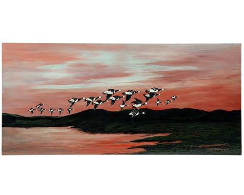 'CROSSING THE LOCH - BARNACLE GEESE' BY COLIN BARNES, an original oil on board signed by the artist, dated 2016, measuring approx. 27in. x 32in.