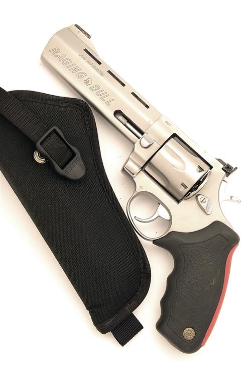 A .44 (MAG) STAINLESS STEEL REVOLVER SIGNED TAURUS, MODEL 'RAGING BULL', serial no. AX557118, with 6in. moulded and ventilated bull-barrel, adjustable sights, swing-out fluted cylinder and soft-rubber stippled grip, complete with a cordura holster for same