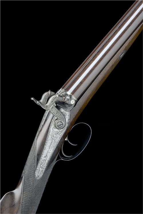 A CASED 14-BORE PERCUSSION DOUBLE-BARRELLED SPORTING-GUN, no visible serial number,