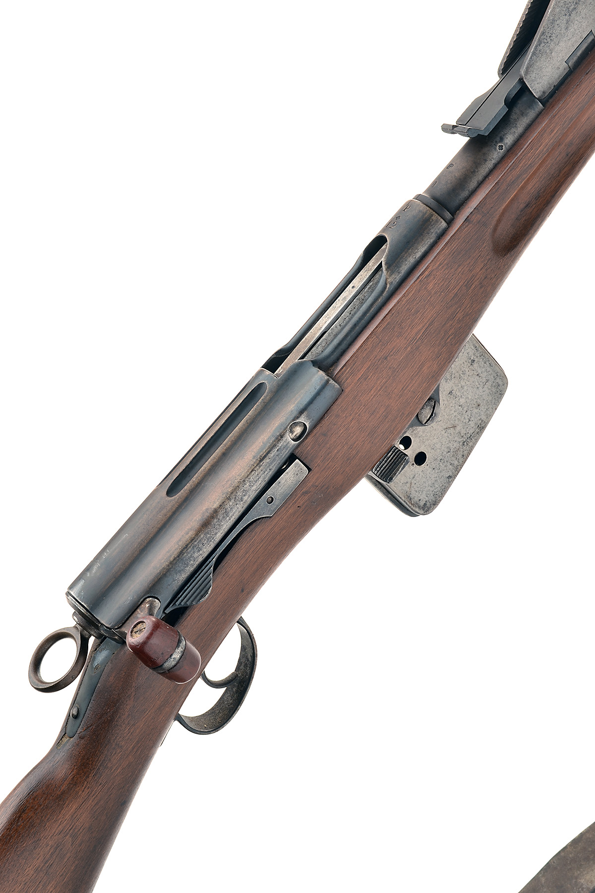 with 30 7/8in. blued sighted barrel, blued receiver, 12in. regulation straight-hand stock (crack at hand), blued exposed magazine with cut-off,leather sling and brass muzzle cover (light surface rust to exposed metal parts, mild bruising to stock)