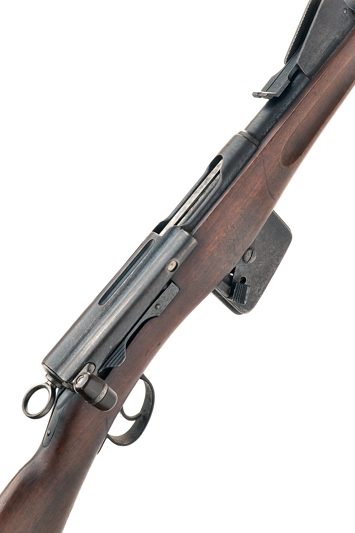 with 30 7/8in. blued sighted barrel, blued receiver, 12in. regulation straight-hand stock, blued exposed magazine with cut-off and iron sling mounts