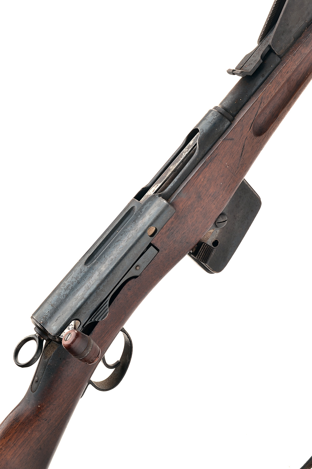 with 30 7/8in. blued sighted barrel, blued receiver, 12in. regulation straight-hand stock, blued exposed magazine with cut-off, leather sling and brass muzzle cover