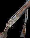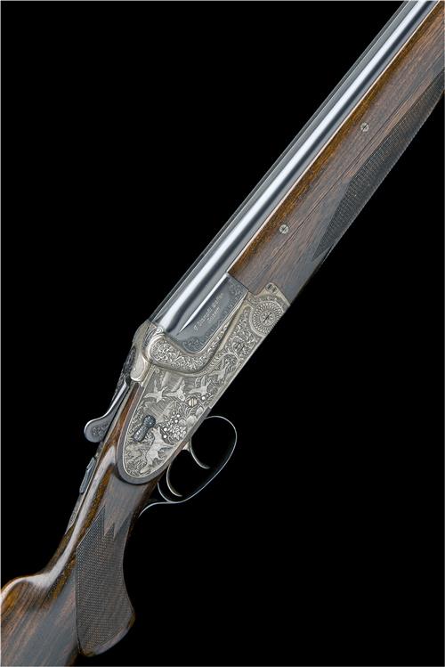 28in. nitro barrels with tapered solid matt top-rib, 2 3/4in. chambers, bored approx. 3/4 and full choke, three-piece fore-end with wooden side fillets, bolstered action with hold-open toplever, manual safety, hand-detachable lockplates with cocking-indicators, articulated front trigger, bold Germanic scroll engraving on a matted background, the lockplates carved in relief with game scenes of hound and fowl, fox and duck, old silver finish, 14 1/2in. figured pistolgrip stock with cheekpiece, pistolgrip-cap, sling swivels and chequered buttplate, weight 7lb. 3oz.
