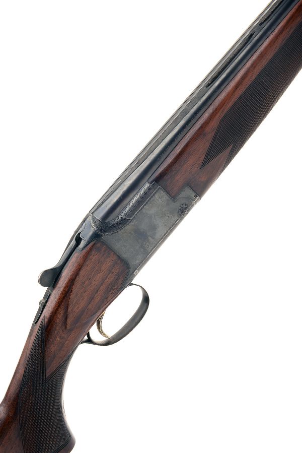 27 1/2in. nitro barrels with 12mm ventilated matt top-rib, 2 3/4in. chambers, bored approx. 1/4 and 1/2 choke, hold-open toplever, manual safety with integral barrel selector switch, gold-washed trigger, border engraving with blued finish, 14in. pistolgrip stock (repaired cracks at head and hand) with raised comb and Browning buttplate, fore-end wood with minor cracks, weight 7lb. 4oz.