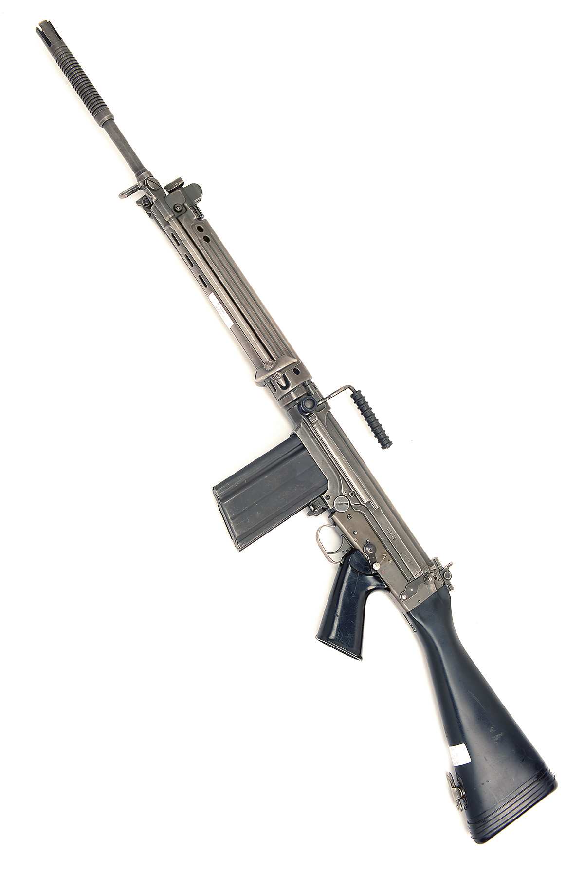 with 22 1/2in. barrel, turned muzzle-break, pressed metal receiver, black plastic butt-stock and grip, folded metal fore-end, detachable box magazine and folding bipod