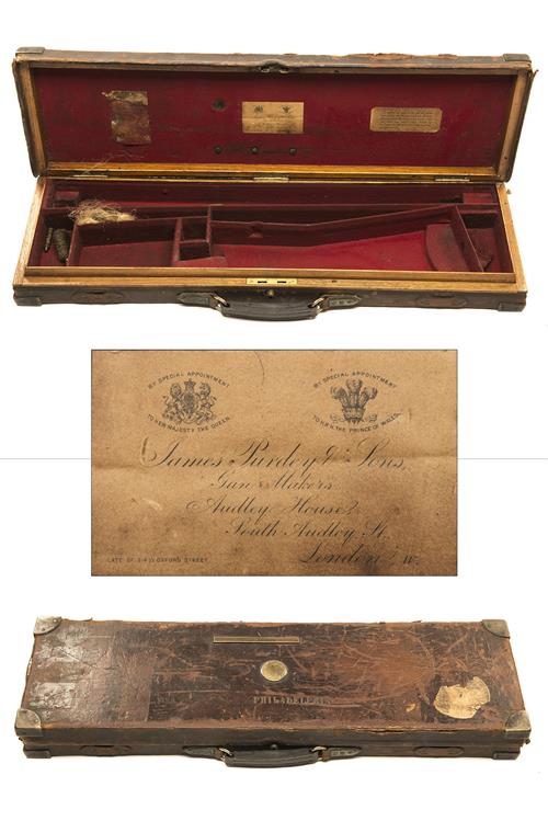 fitted for 30in. barrels, the interior lined with red baize, a James Purdey & Sons trade label, central brass push-button lock (key missing), the lid exterior embossed with 'PHILADELPHIA' and with a central brass escutcheon