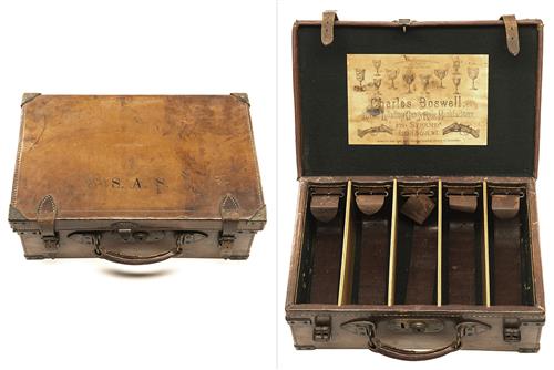 for approx. 250 cartridges, the interior lined with green baize, a Charles Boswell trade label, four removable oak dividers, five leather lifters (one damaged), brass lock (key missing), the lid exterior with the monogram 'S.A.S.'