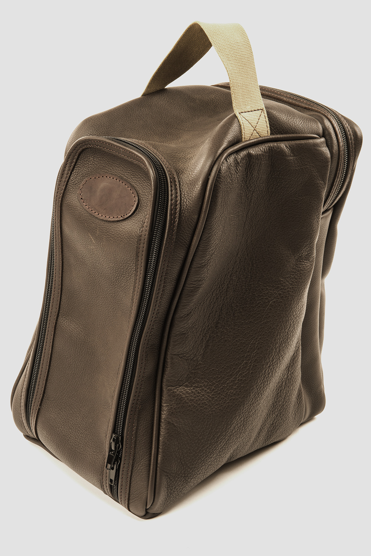 A JO YORATH ENGLISH BEST LEATHER BOOT BAG, fitted for a pair of boots and an accessory compartment, canvas carry handle