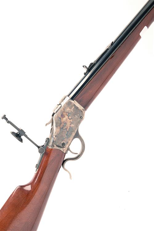 A. UBERTI, ITALY .45-70 SINGLE-SHOT FALLING-BREECH TARGET-RIFLE, MODEL 'WINCHESTER'S 1885 HIGHWALL', serial no. 225, 28in. heavy nitro barrel, tunnel fore-sight, buckhorn rear-sight, colour hardened slab-sided receiver, polished falling breech, folding tang peep-sight, walnut straight-hand butt-stock with iron crescent heel-plate