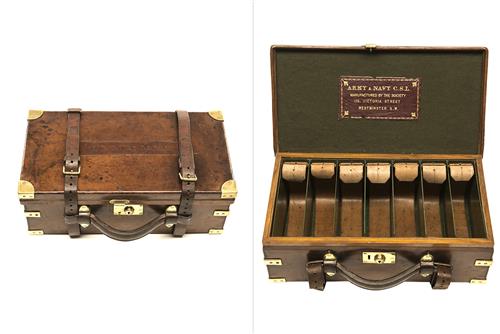 ARMY & NAVY C.S.L. A RARE BRASS-BOUND OAK AND LEATHER CARTRIDGE MAGAZINE,