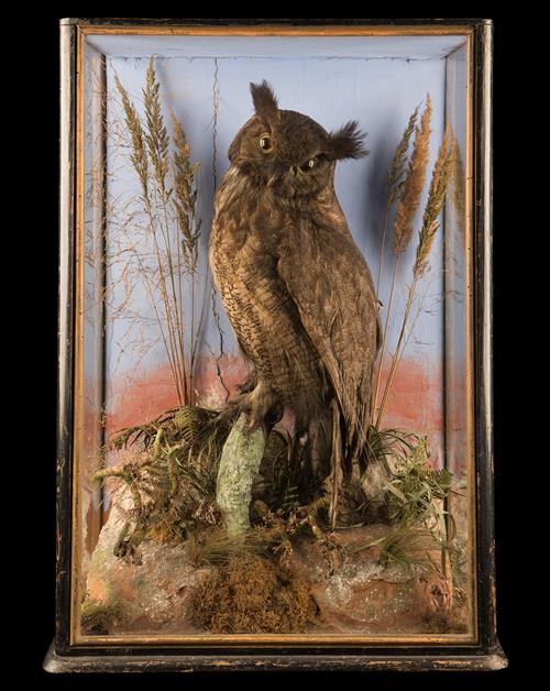 A VINTAGE CASED FULL-MOUNT OF AN EAGLE OWL,