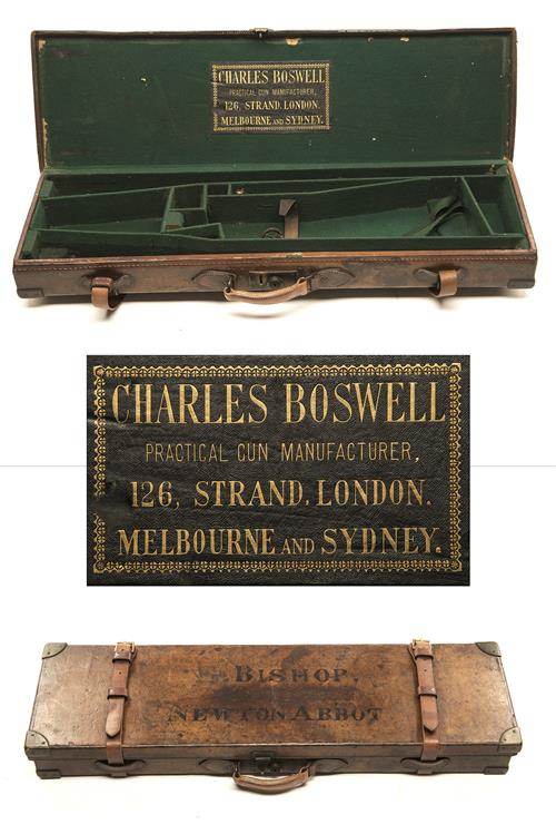 fitted for two sets of 30in. barrels, the interior lined with green baize, leather gold-tooled Charles Boswell trade label, brass lock (key missing), the lid exterior with 'BISHOP OF NEWTON ABBOT'