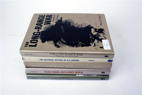 A COLLECTION OF FIVE BOOKS ON MILITARY SNIPING, comprising of 'THE LONG RANGE WAR - SNIPING IN VIETNAM' by Peter R. Senich, 'A PICTORIAL HISTORY OF U.S. SNIPING' by Peter R. Senich, 'FIREARMS IN COLONIAL AMERICA - THE IMPACT ON HISTORY AND TECHNOLOGY, 1492-1792' by M.L. Brown, 'THE ONE-ROUND WAR - USMC SCOUT-SNIPERS IN VIETNAM' by Peter R. Senich, 'U.S. MARINE CORPS SCOUT-SNIPER - WORLD WAS II AND KOREA' by Peter R. Senich