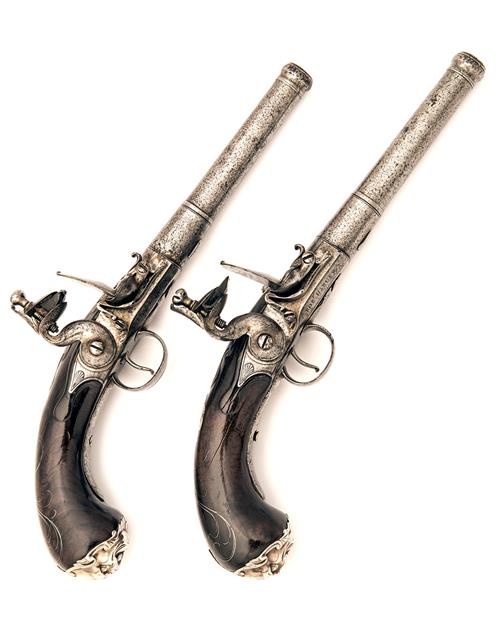 circa 1775, with multi-staged tapering round 5 1/4in. iron barrels (frozen), moulded bands at the intersections and muzzles, the rear of breech with London proofs and an engraved band of arabesques, applied screw-down top-tangs, the underside of breech signed 'ROBT. HARUEY' (sic), border and shell engraved locks, recumbent 'L' shaped frizzen-springs, borderline engraved top-jaws and frizzen fronts, the latter with central tear-drop motifs, bulbous walnut butts (one pistol with wood loss below lock and cracks), silver grotesque mask butt-caps, silver wire scroll inlays to both butts, silver pierced acanthus scroll side-plates and escutcheons to both wrists, guarded triggers