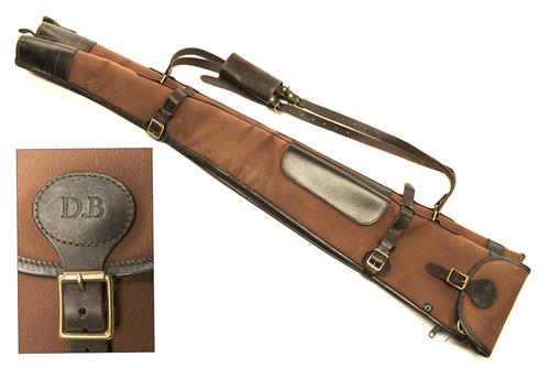 for approx. 48in. guns, leather shoulder strap and brass fittings, the closing flap with the initials 'D.B.'
