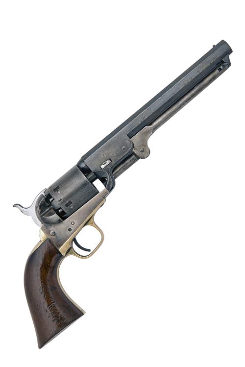 for 1866, all number stamps co-marked with a letter 'L', octagonal 7 1/2in. barrel, the breech end signed 'ADDRESS COL SAML. COLT NEW-YORK U.S. AMERICA', London proofs, plain cylinder with traces of roll-engraved scene (lightly cleaned, some frosting), open iron frame with strong traces of colour, brass trigger-guard and grip-straps, smooth walnut one-piece grip stamped with the 'Enfield' roundel and colour-hardened articulated under-barrel loading lever, strong amount of finish remaining, possibly renewed in antiquity