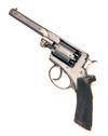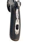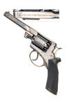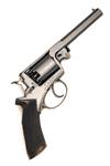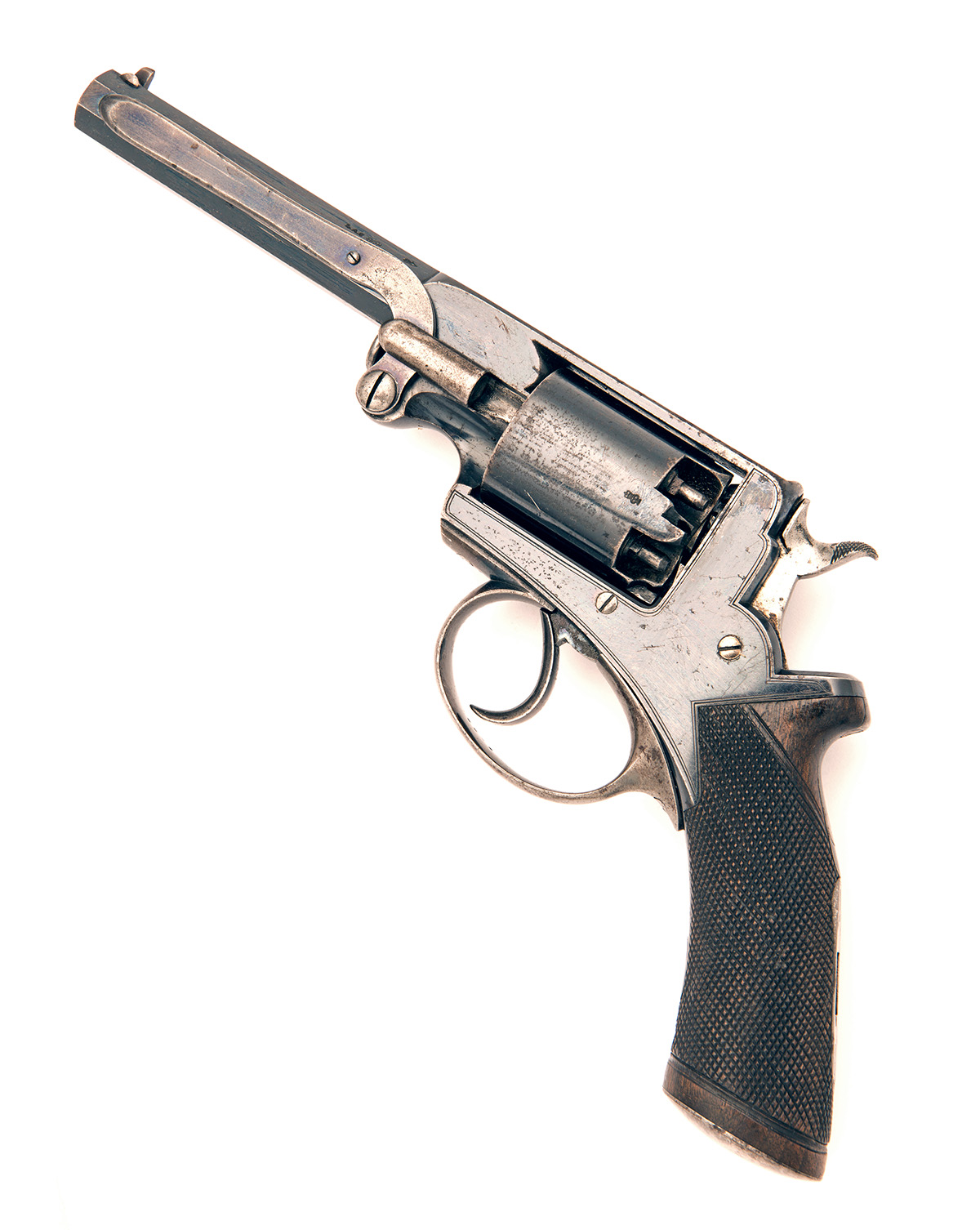 circa 1860, with blued octagonal integral 5 3/4in. barrel, dove-tailed fore-sight, standing notch rear-sight to rear of top-strap, the top-strap signed 'ROBERT ADAMS 76 KING WILLIAMS STREET, LONDON E.C.', the top-strap also engraved with an armorial of an arm clutching a wreath over the gothic initials 'G.E.G..', London Armoury stamps to barrel and cylinder arbor mount, borderline engraved frame with sliding cylinder lock and marked 'B16754' over 'ADAMS PATENT No. 32428R', the same number repeated on the plain blued cylinder, semi-sawbacked chequered walnut one-piece grip, the rear inlet with a socket for a detachable shoulder-stock (absent), shallow domed iron pommel cap and guarded trigger, articulated rammer to the left hand side of barrel, the whole retaining the majority of its original factory blued finish