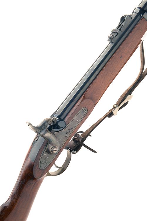 A REPRODUCTION .577 PERCUSSION RIFLE SIGNED PARKER-HALE, MODEL '1853 TWO-BAND', serial no. 6026, with blued 33in. sighted barrel, colour-hardened lock, walnut three-quarter stock and brass furniture, complete with a leather sling