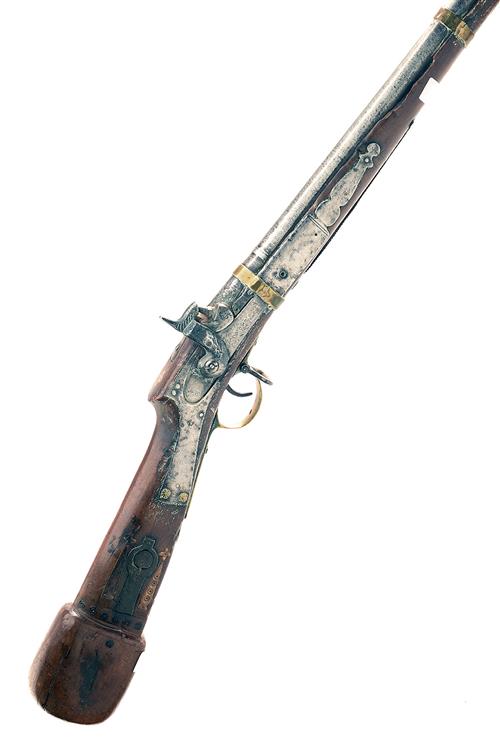 A 28-BORE PERCUSSION MUSKET, UNSIGNED, no visible serial number, Indo-Persian circa 1870, with iron 33in. two-stage barrel stamped with a makers mark at breech, European borderline engraved lock and wood full-stock with applied brass decoration, worn throughout