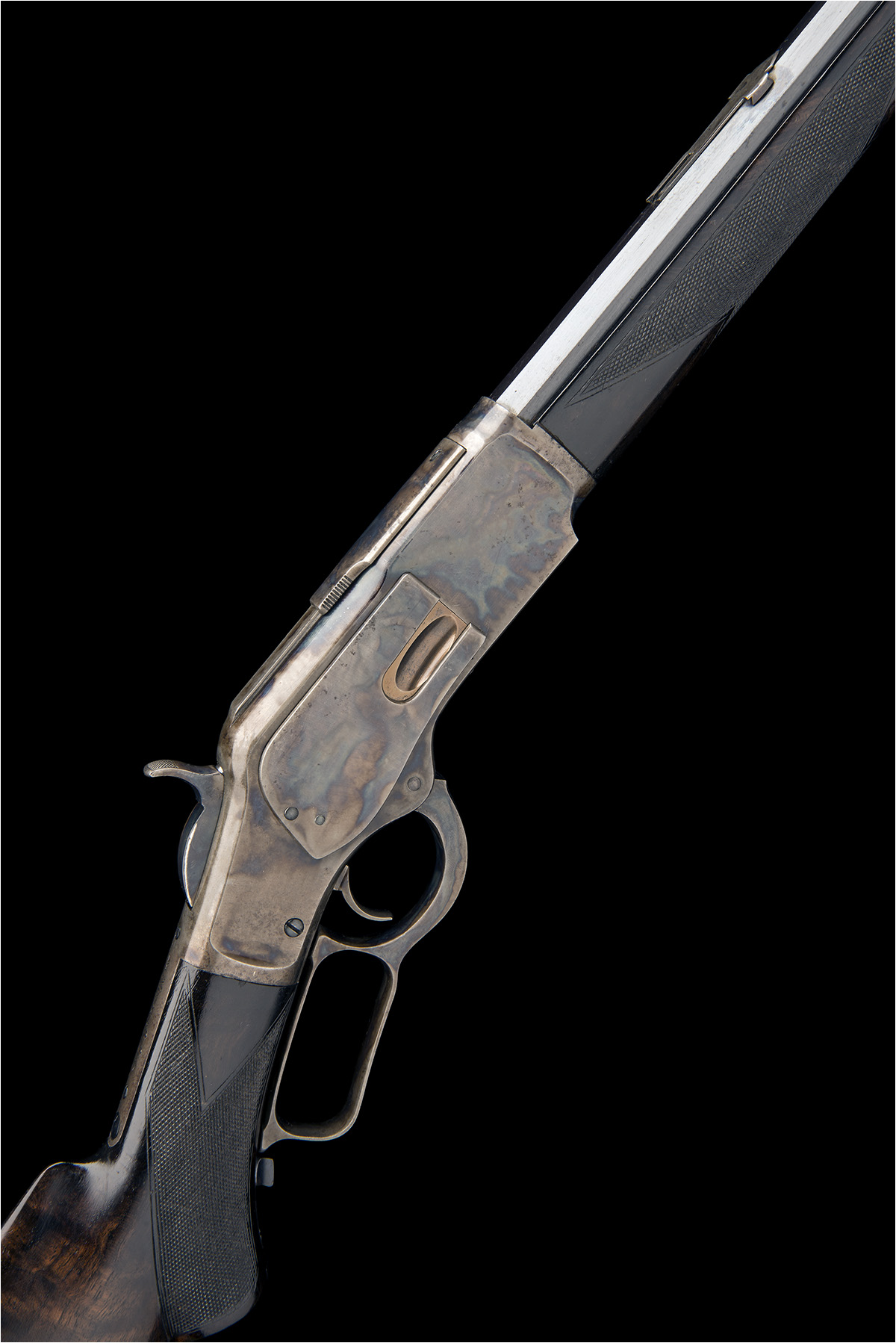 for 1883, with re-blued octagonal 24 1/4in. barrel signed ' WINCHESTER'S REPEATING ARMS NEW HAVEN CT.' over 'KING'S IMPROVEMENT' and patents of 1866 and 1860, dove-tailed fore-sight with nickel blade, rear-sight at fault (originally of buckhorn style), period London proofs, colour-hardened receiver with stepped bridge at breech, sliding dust-cover, top-tang marked 'MODEL 1873', highly-figured walnut butt-stock with chequered pistol-grip, blued shotgun heel-plate, curved colour-hardened finger-lever, cartridge designation to the brass lifter, highly-figured chequered walnut fore-end, colour hardened nose-cap and blued full length under-barrel tubular magazine, colour possibly expertly renewed, with a copy of a Winchester Heritage letter