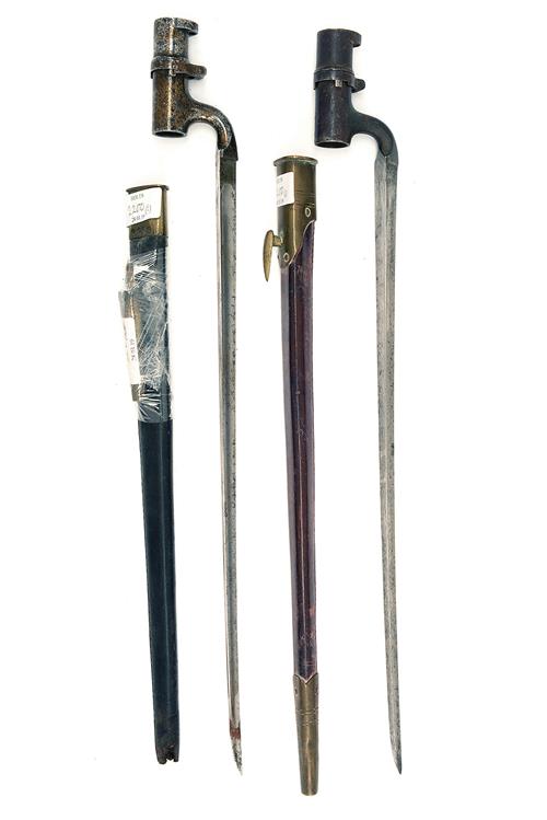 TWO BRITISH SOCKET BAYONETS, both variations of the Pattern '53, both with their respective brass mounted scabbards, one in black leather (chape loose) the other brown (2)