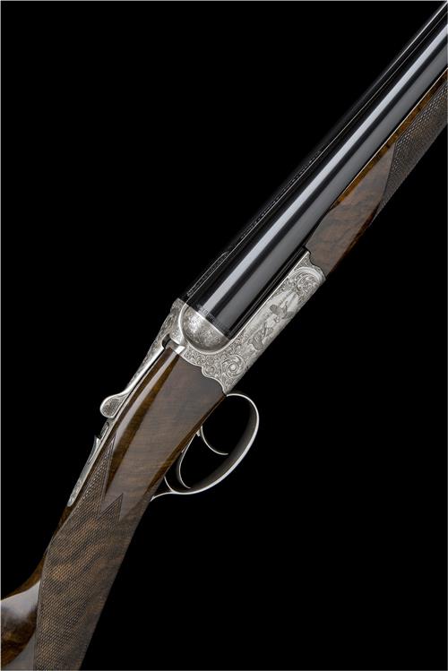 27 1/2in. nitro barrels, the rib engraved 'PROGRESS - CHAPUIS ARMES - FRANCE.', 2 3/4in. chambers, bored approx. 1/4 and 1/2 choke, scroll-back action, removable striker discs, manual safety, rolled-edge triggerguard, border and acanthus scroll engraving surrounding vignettes of partridge in flight, signed 'Granger', 15 1/4in. figured stock including wooden buttplate, weight 6lb. 6oz., in its makers universal case