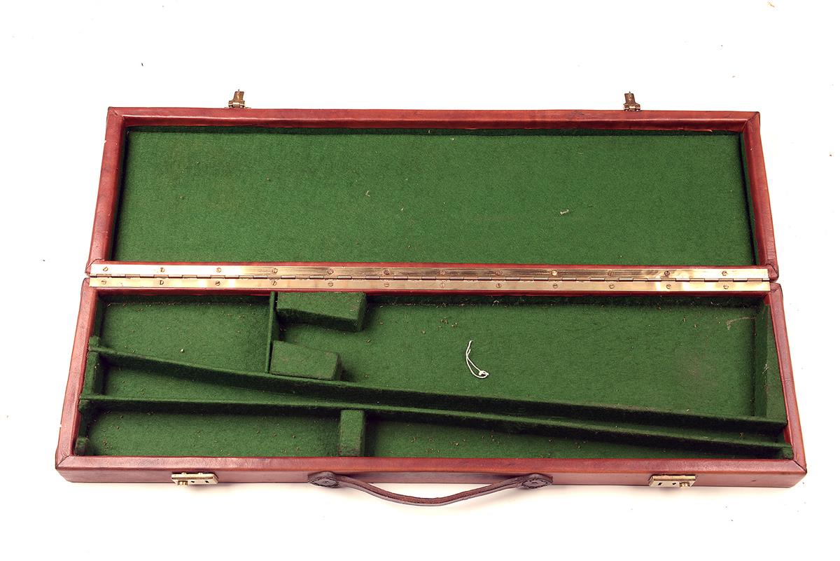 A SINGLE TAKE-DOWN GUNCASE, fitted for 27in. single barrel, the interior lined with green baize, two locks, keys missing), the lid exterior tooled with game scene